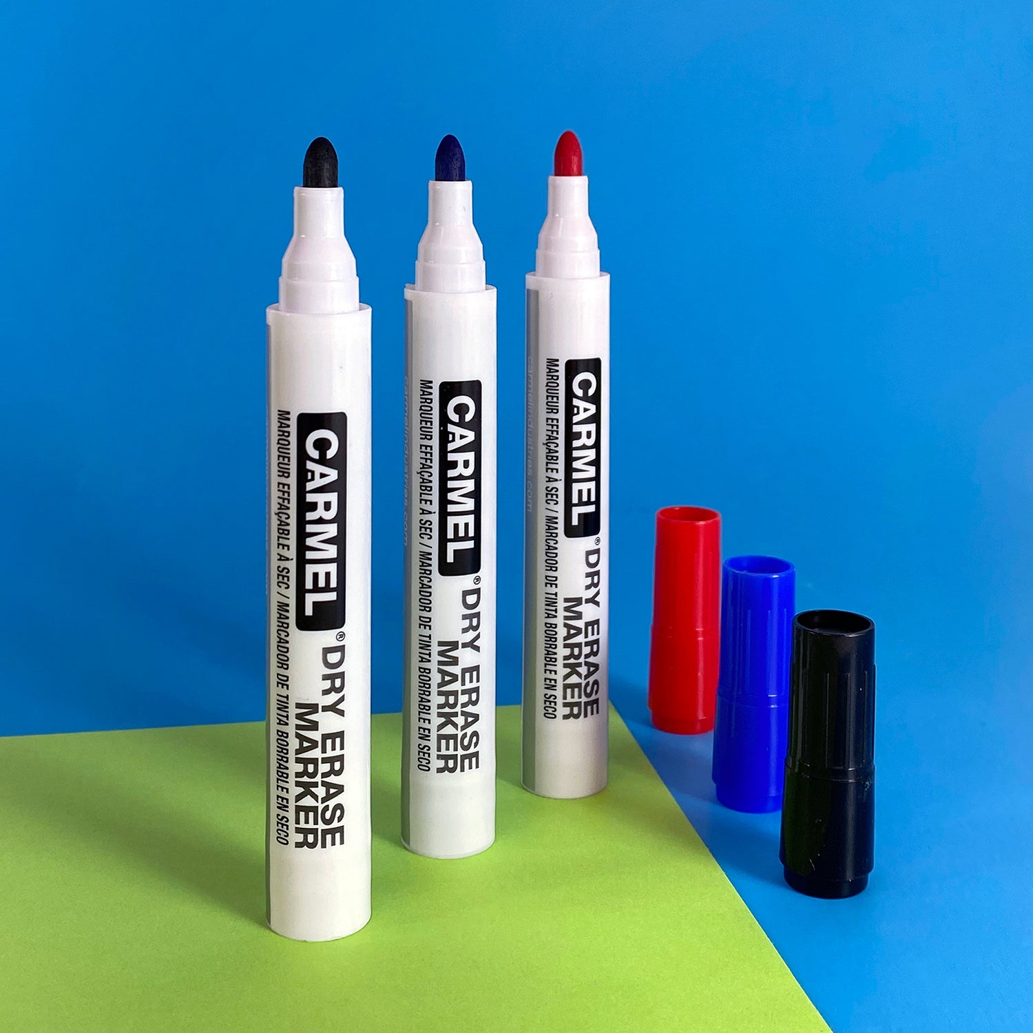 Los marcadores de borrado seco de Carmel contienen tinta a base de agua, que es borrable con un paño seco. La punta del marcador está en ángulo, perfecto para escribir líneas delgadas o gruesas, y viene en azul, rojo y negro. Este producto es ideal para pizarras, tableros de menú y superficies laminadas.