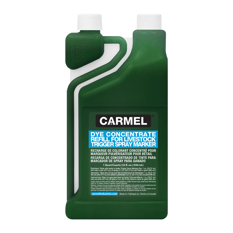 El tinte concentrado de carmel para marcar el ganado es solvente y VOC (compuesto orgánico volátil) gratis. Este tinte de alta concentración se debe diluir con agua y se usa con la botella de spray de ganado Carmel. El pigmento verde es muy visible en el ganado y es perfecto para la reproducción, las vacunas y la identificación del ganado.