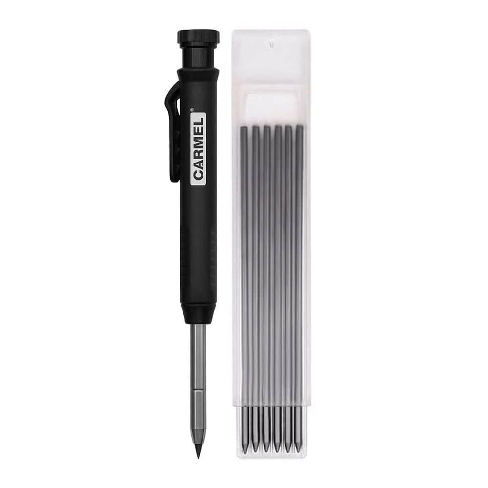 This woodworking pencil holder has a thin needle-nosed tip making this pencil suitable for marking through smaller drill holes or in other tight areas than other woodworking markers. The solid carpenter pencil can draw on metal, plastic, glass, wood, and paper. In addition to the black lead, the carpenter's pencil refills also come in yellow and red pencil lead for marking dark surfaces. Lead is sold separately.