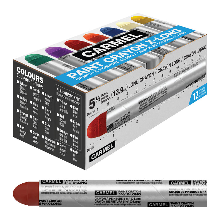 Carmel Paint Crayon applique des lignes claires de peinture fraîche et est Enveloppé dans du papier ou des manches en carton, Garder les doigts propres tout en marquant des surfaces lisses et texturées.
