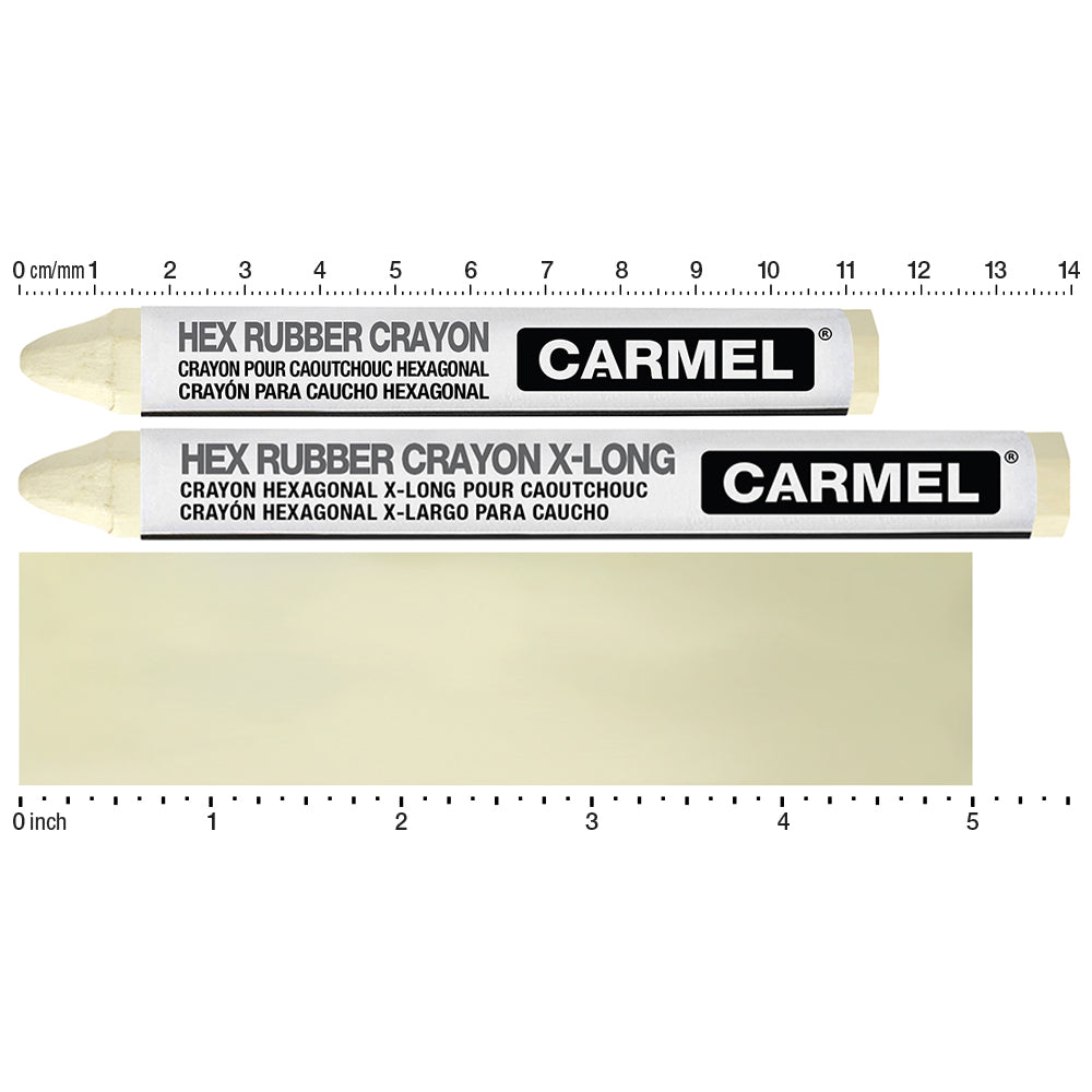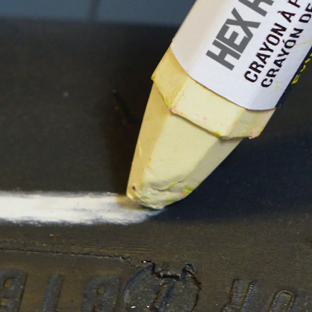 Le Crayon de marquage pour caoutchouc Carmel est disponible en jaune ou blanc pour des marquages lumineux visibles dans des zones de faible luminosité. Ces crayons sont parfaits pour marquer les pneus et autres surfaces en caoutchouc, qu'elles soient mouillées, sèches, sales ou lisses. Le Crayon hexagonal pour caoutchouc et la version extra longue sont disponibles en jaune et blanc, tandis que la version Jumbo rectangulaire est uniquement disponible en blanc.
