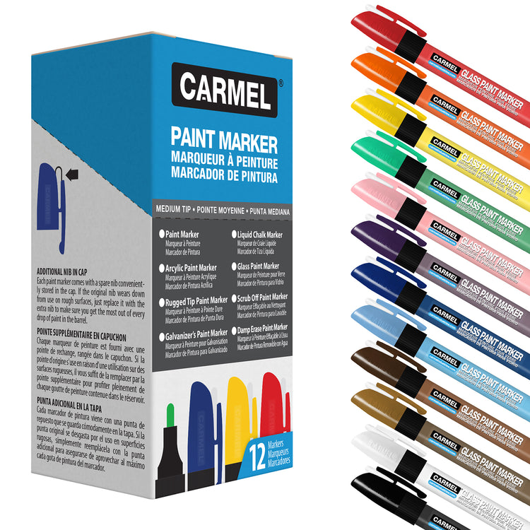 Carmel Glass Paint Markers are perfect for marking car windows, restaurant boards, store windows, or anywhere temporary markings are desired. The markings are removable from smooth, non-porous surfaces with a damp cloth and glass cleaner.