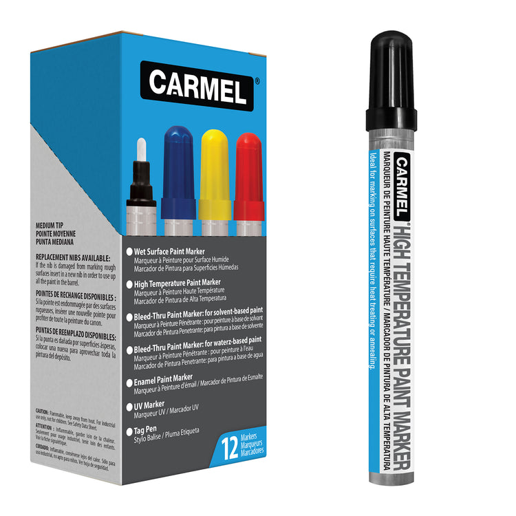 The High-Temperature Paint Marker is designed for marking surfaces that will be exposed to high heat. Mark readability is maintained at temperatures up to 1600°F (871°C), making it ideal for heat treating and annealing. It applies vivid paint marks that remain legible during extreme heat exposure. Perfect for use in welding, forging, casting, bronze assemblies, and metal ingot marking, this marker produces fine to bold lines with a fast-drying, high-performance paint formula. Whether you're working with stainless steel, aluminum, titanium, or other alloys, this marker ensures clear, durable identification throughout high-temperature processes.