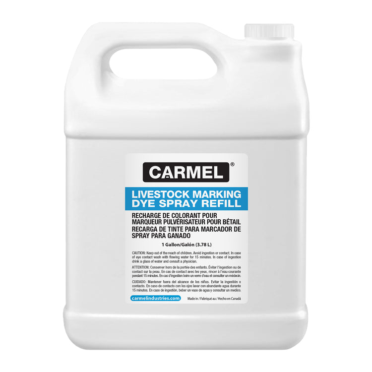 Carmel Livestock Marking Dye Spray Refill is a safe and effective water-based solution for marking livestock. Ideal for tasks such as breeding, vaccinations, and identification. Free of solvents and VOCs, this dye is safe for use on animals and is available in a range of colors, including red, orange, green, blue, and pink, allowing for clear and distinct markings. Designed for use with a spray bottle and nozzle (sold separately), this dye offers farmers a practical and versatile tool for easily marking livestock, whether applied at close range or from a distance.